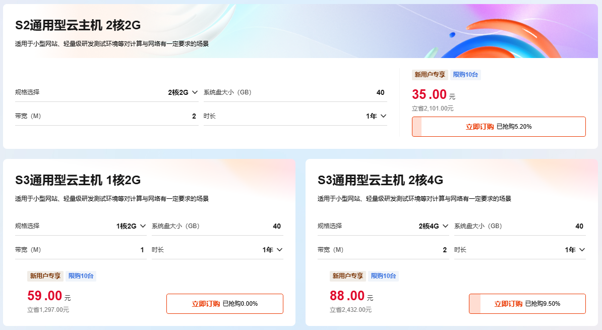 短期优惠:限时抢购爆款S3通用型云主机1核2G尝鲜价33.9元/3个月。