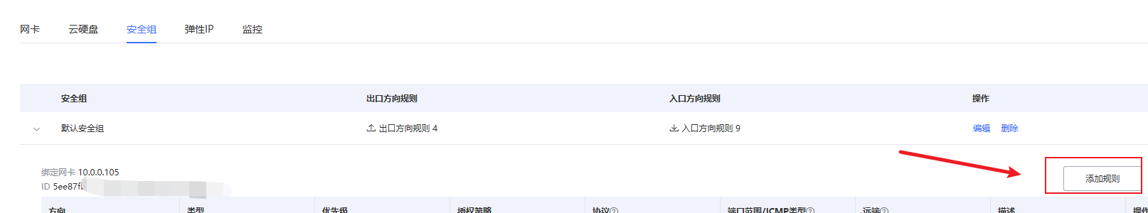 其次,防火墙管理,我找了半天没有找到入口,最后发现需要点击实例名称,里面有个安全组来设置放行端口。